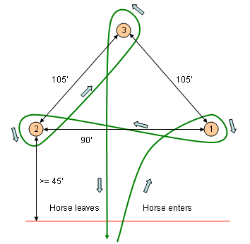 Three barrels are set up in a line and a very low jump is placed at the start/finish in line with the middle barrel. Horse & rider try to make the fastest time through the course without knocking over any barrels. Jump, loop around middle barrel, loop around right barrel, weave past middle barrel, loop around left barrel, loop around middle barrel, back to jump. [Video Example]